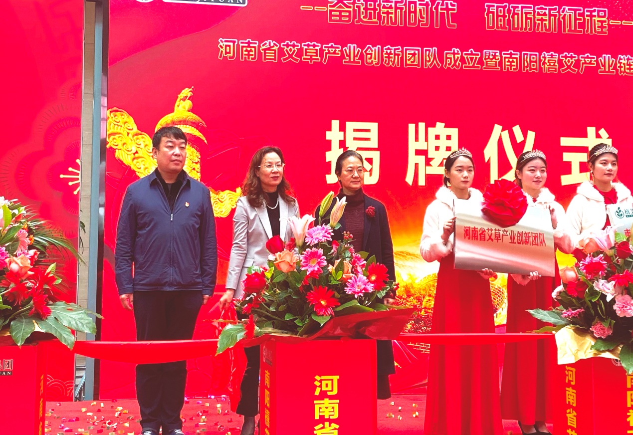 南阳理工学院副校长张爱红、南阳卧龙综合保税区管委会主任李海源、南阳市科技局二级调研员毕跃莲、郑州大学药学院副院长毕跃峰等共同为河南省艾草产业创新团队成立揭牌。